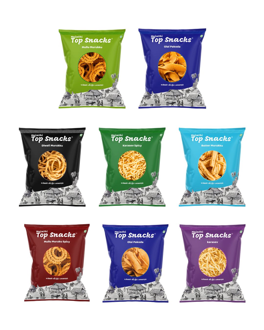 Not sure where to begin? Our 8 Pack Trial Snack Box lets you explore the authentic flavors of South India in one delightful combo Mullu Murukku, Spicy Mullu Murukku, Olai Pakoda, Diwali Murukku, Butter Murukku, Karasev, and Spicy Karasev.